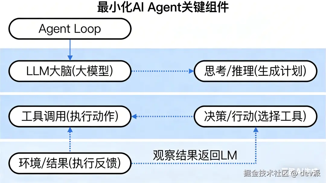 在深入代码之前,我们需要理解AI Agent的三个核心组成部分: