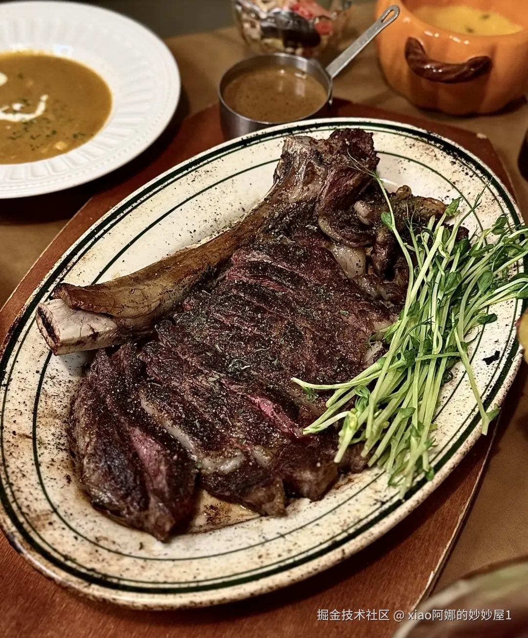 @参考图 生成温馨明亮的高级美食餐厅场景。电影级高清视觉,微距特写。画面中心是一块正在铁板上滋滋作响的战斧牛排,柔和的暖光顶灯照明,牛排表面流淌着诱人的油脂光泽。木质餐桌摆设精美,景深模糊,细节极其丰富,去除所有噪点,顶级美食探店 Vlog 质感。