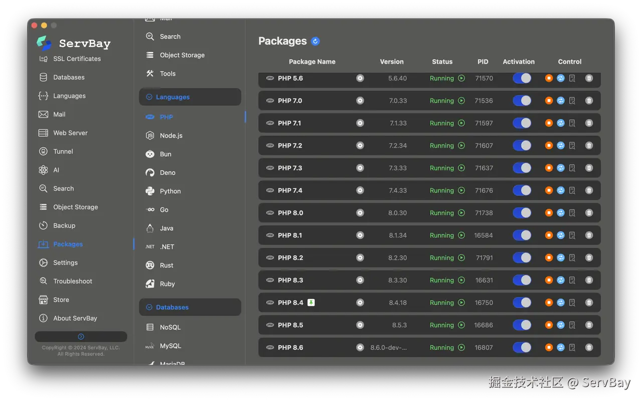 无论是需要快速切换 PHP 版本来验证异常兼容性,还是部署数据库和缓存服务,ServBay 都能做到即插即用。它把环境运维的杂事都处理好了,开发者能腾出精力去摸鱼了,而不是在环境配置上踩坑。