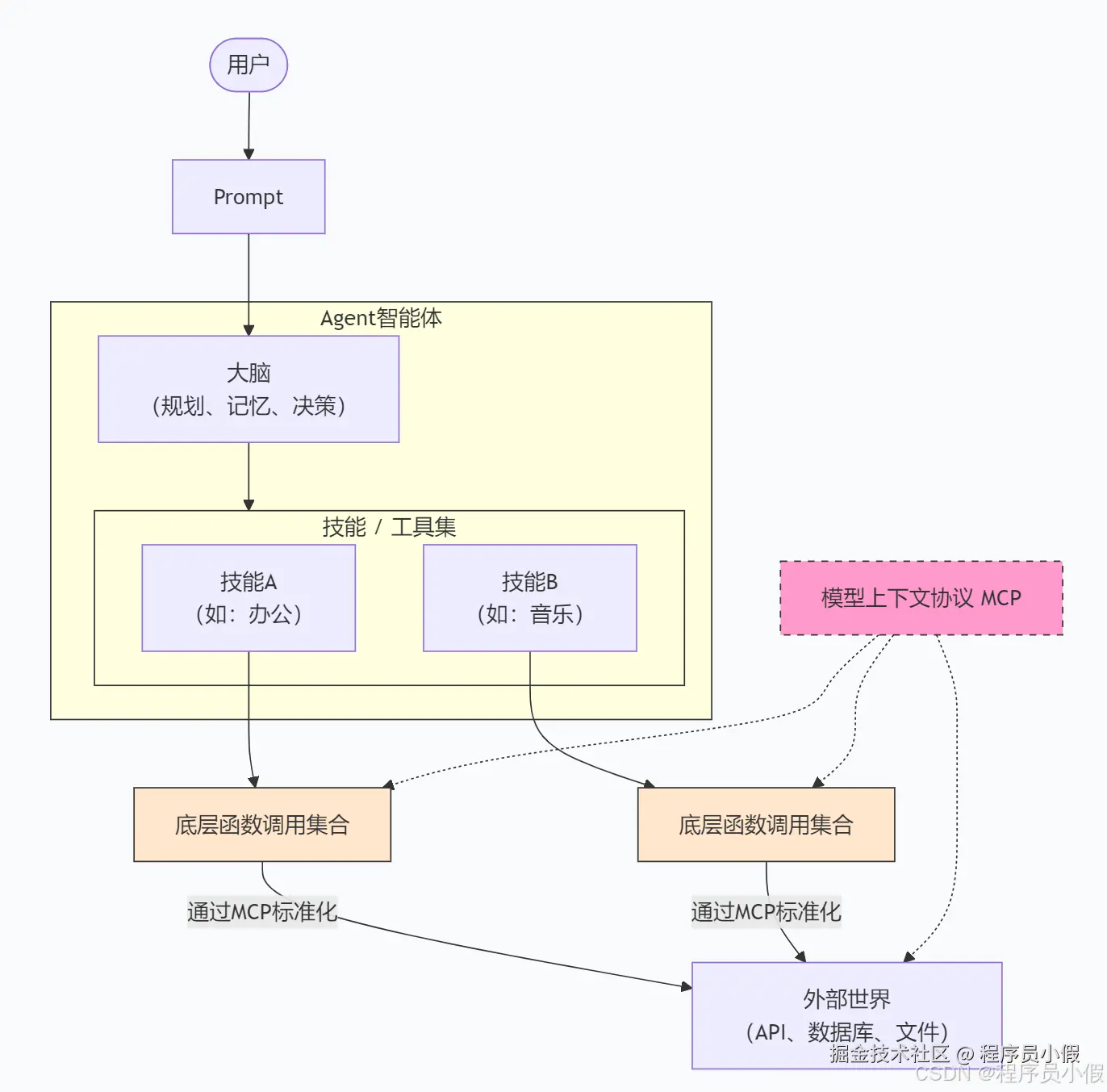 | Skill | 能力包 | 应用/产品层 | 如何将一组相关功能打包,方便 Agent 调用? | 它是“技能包”或“应用”,是组织 Function Call 和 Prompt 的高级单元。Agent 通过拥有 Skill 来获得能力。 |