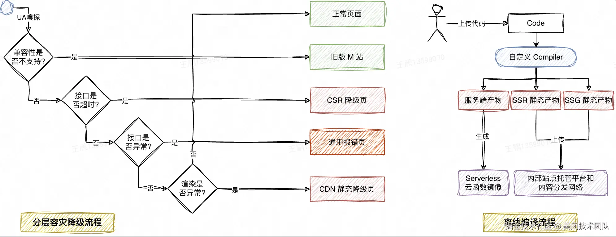 针对新项目,我们在离线构建阶段同时构建了可用于 Node 持久化部署的 SSR 产物和可用于 CDN 分发的静态生成式站点(SSG)产物。该 SSG 产物在离线构建流水线中就被同步上传至内部 CDN。当 Serverless 云函数内部发生渲染失败(如模板解析异常、接口返回报错)或是上下游链路发生故障时,自动触发弹性容器平台的被动降级策略,直接从 CDN 返回预构建的静态产物,保障页面基础内容的可用性;