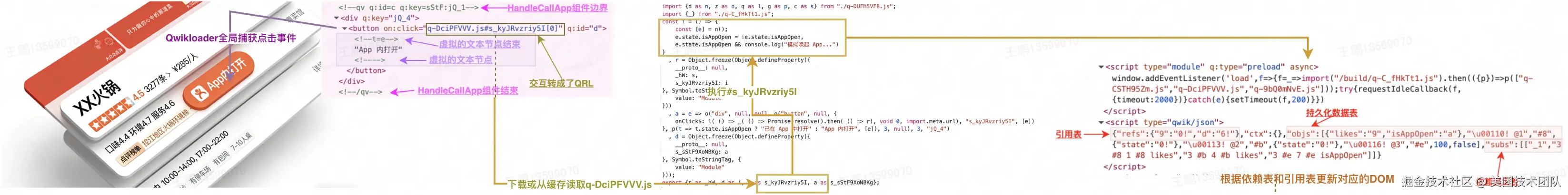 客户端加载完编译后的 HTML 后,全程无需执行全量应用 JS,无需重建组件树,无需绑定全局事件,仅通过极小体积的 Qwikloader 实现 “按需恢复交互”。以点击唤端按钮为例,整个流程分为三步: