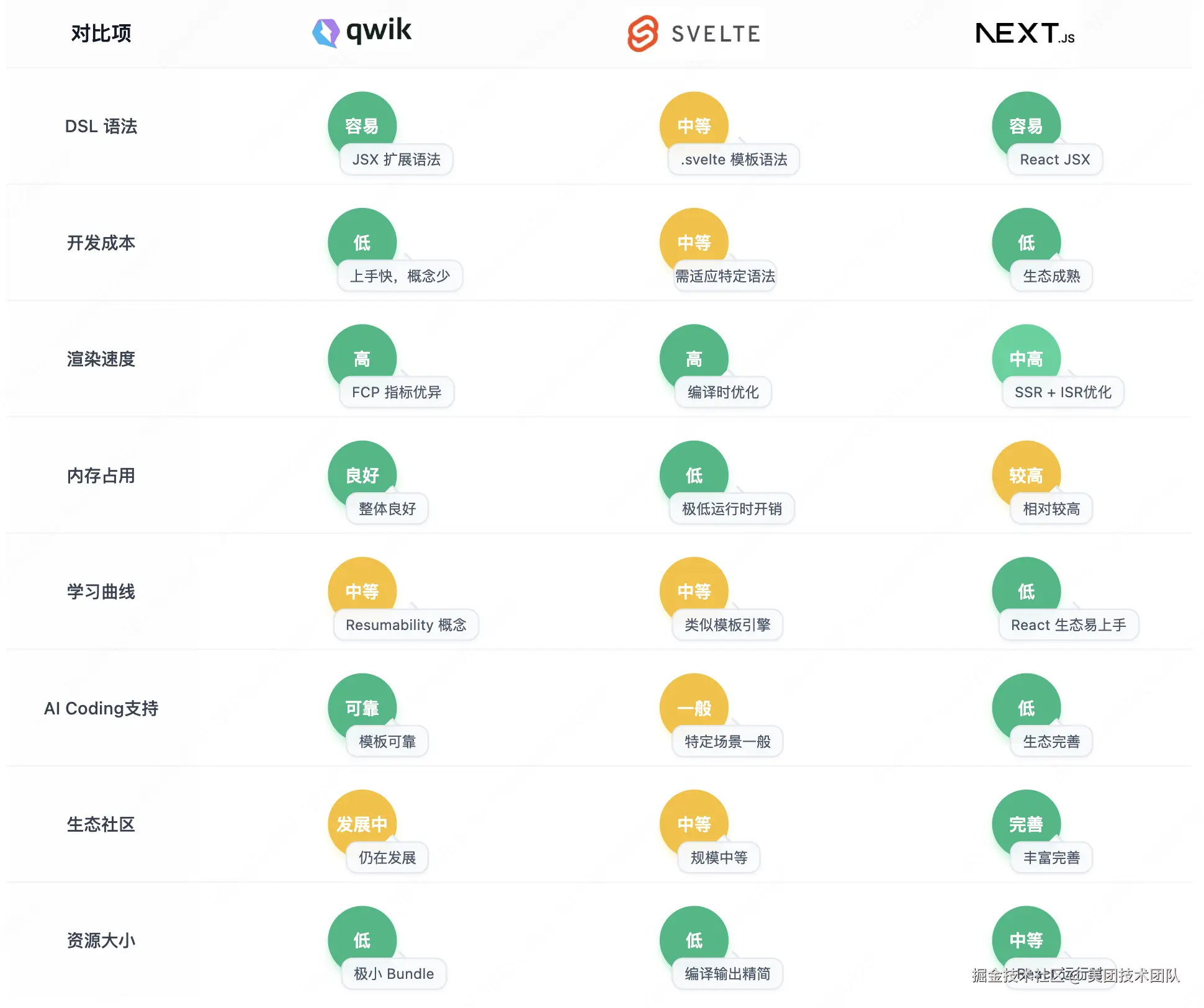 完全以 React 为模板的 Next.js 作为公司站外生态的成熟基建方案,具备稳定、易落地、学习成本低的优势,但在站外纯 H5 场景下受限于无容器预请求、无 JS 预加载而无法“借力”,其性能表现存在明显上限,此前已使用 Next.js 重构的 M 站 UGC 详情页(非同构)的首屏体验仍有提升空间。Next.js 是稳中求进的选择,但要实现性能的破局式提升,需要探索一些更具挑战性、前沿性的技术选型;SvelteKit 的 DSL 不太主流,学习成本稍高;Qwik 作为前年发布的新兴框架,生态尚不完善,在公司内甚至是国内主流互联网厂商内都没有公开落地的案例,只能依赖官方文档解决问题,框架的认知门槛与工程化落地成本也相对更高。