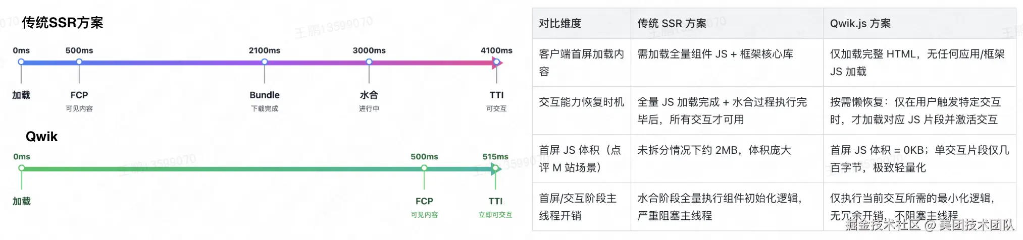 Qwik 之所以快速,并非因为它使用了巧妙的算法,而是因为其设计方式使得大部分 JavaScript 无需下载或执行。这套 Resumability 设计原理完全区别于传统 SSR 的技术体系,从根源上解决了传统 SSR 方案中首屏 JS 体积臃肿、水合过程阻塞主线程、交互恢复延迟等痛点。此外,这套无需水合的流程使得渲染性能得到提升,在低端设备上的内存压力得到缓解。为了更直观地对比这种技术差异,我们对传统 SSR 方案与 Qwik.js 方案进行详细的对比分析: