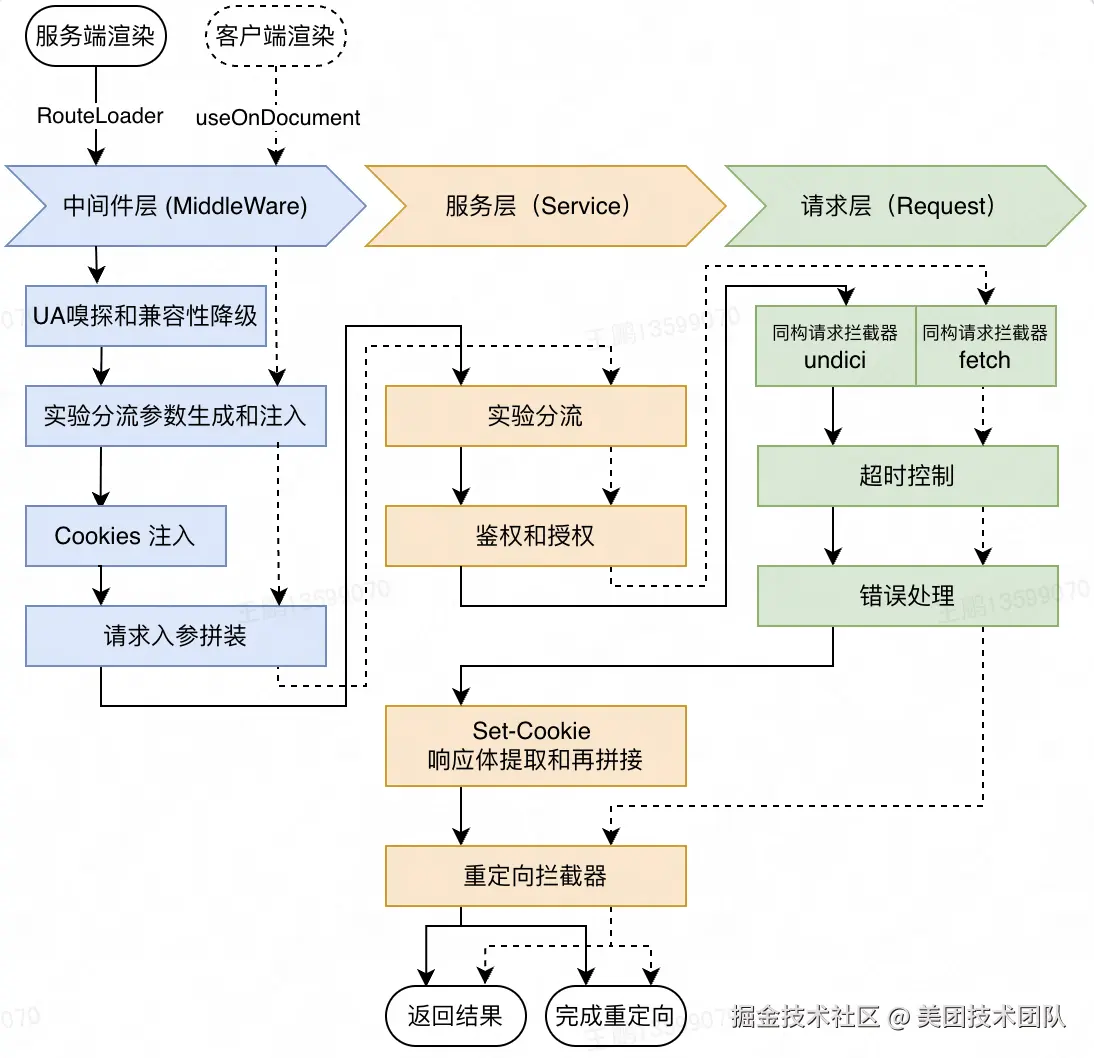 如果从 0 开始搭建这套容灾架构,我们需要考虑正常 SSR 渲染链路、CSR 降级链路、静态降级页中的 CSR 链路以及正常渲染链路的二次刷新等四套不同的数据获取链路,同一个接口我们难道要各写一套逻辑去兼容这四种链路?当然不是。封装一个通用的同构请求拦截器是我们能实现这一降级机制的关键。AB 实验接入、微信鉴权、超时控制、错误处理等逻辑在双端的差异被我们在拦截器内部抹平,使得研发在接入新接口时无需关注这些兼容问题。