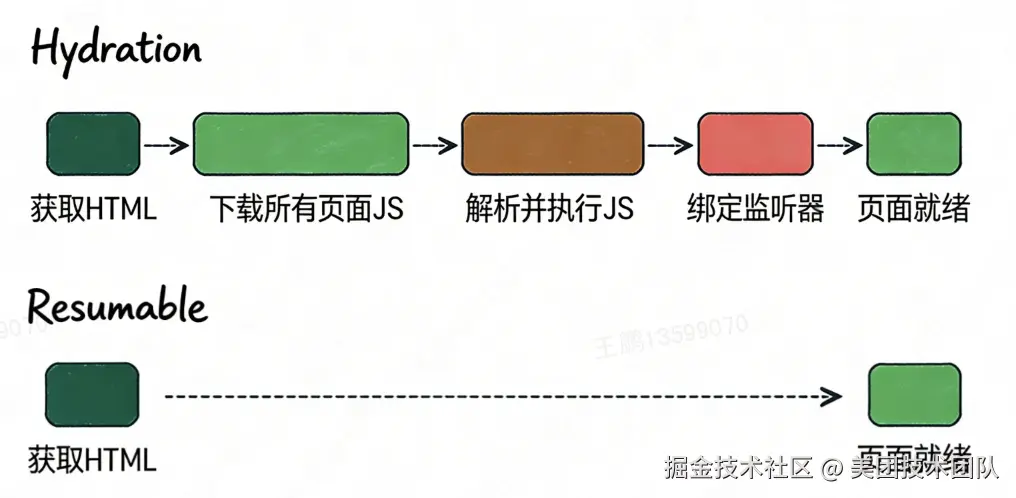 无论是纯客户端渲染(CSR)还是主流的服务端渲染(SSR),传统前端框架的交互能力恢复都离不开水合这个环节。水合的是客户端对服务端预渲染 HTML 的激活过程。服务端仅能输出无交互能力的静态 HTML,想要让页面具备点击、跳转、数据更新等交互能力,客户端必须完成三个核心动作:
