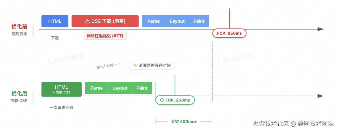 我们基于 Qwik 的 useStylesScoped$ 钩子结合 Vite 的编译能力,编译时通过 Vite 的 ?inline 查询参数将组件的样式文件在构建过程中提取为字符串,服务端渲染时这些样式片段直接被注入到 <style> 标签中。这一优化彻底消除 CSS 资源的网络往返时延(RTT),当 HTML 下载完成的瞬间 CSSOM 树即构建完成,浏览器可以立即进行 Layout,直接达成 首次内容绘制(FCP)。使 FCP 时间 TP90 降低 100+ms,对性能指标提升明显。