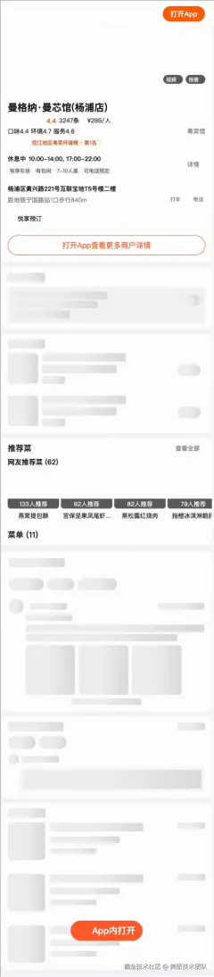 什么是 M 站?M 即 Mobile,对大众点评而言,M 站是面向公域的流量引流入口,经近年 M 站与 PC 站形态融合、交互链路剥离后,定位进一步明确为“信息展示 + 点击唤端”的极简触点。我们所维护的大众点评 M 站,也由此聚焦至商户详情页、内容详情页、首页这三大高流量页面。在移动互联网流量进入精细化运营的背景下,主流互联网厂商均将交易、内容生产等高用户价值链路从站外转移至 App 站内,而 M 站则成为全域流量的核心收口与高效转化载体,承担着将搜索引擎、社交生态、厂商合作等渠道的免费或低成本公域精准流量,转化为 App 日活用户(DAU)的最后核心节点。作为大众点评对外流量的第一触点,这类页面无复杂的业务交互链路,只聚焦于“让用户看到信息 → 觉得有价值 → 点击唤起 App” 的极简转化逻辑。
