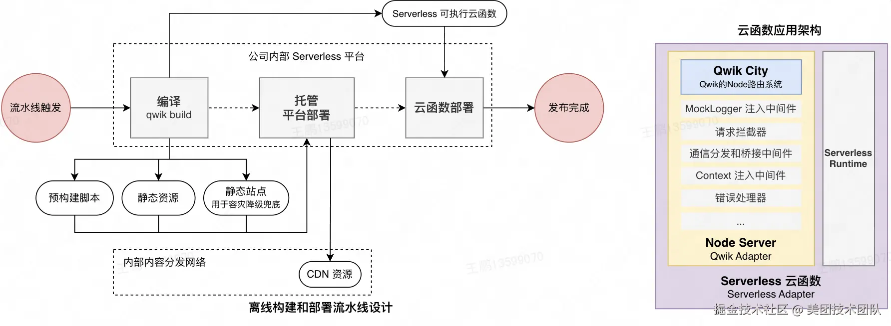 鉴于公司内部成熟的 Node.js 运维体系,我们选择公司 Serverless 平台作为 BFF(Backend for Frontend)宿主,复用其请求拦截、日志监控、容灾、负载均衡等基建能力。但由于框架兼容性与运行时环境约束,Qwik 无法直接接入现有 Serverless 平台运维体系,我们团队通过自研适配方案,攻克这一难题,进行了一系列的架构适配及增强优化: