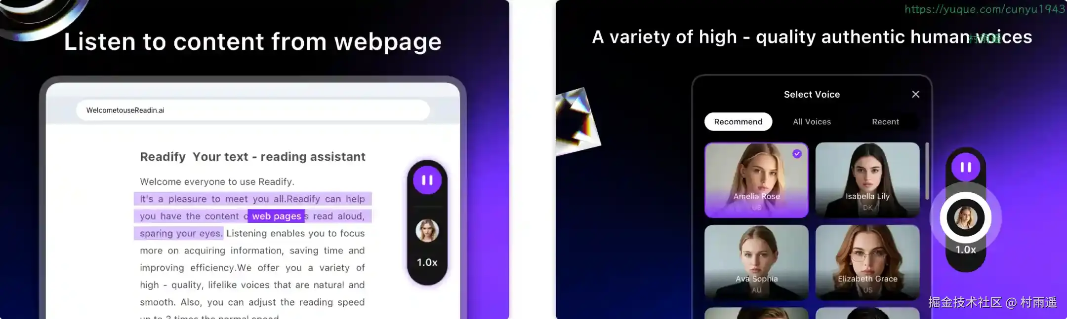 AI 仿真朗读阅读器,利用 AI 文本转语音 (TTS) 技术将网页内容转换为音频(支持 30 多种语言),并提供语速控制、文本高亮和悬浮控件等功能。