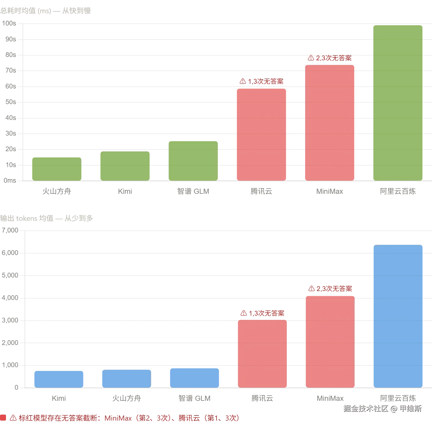 从这个图表来看,腾讯云,MiniMax,阿里云百炼可以先排除了,速度慢,token 消耗多。其中有两位选手,还常常答不出来。