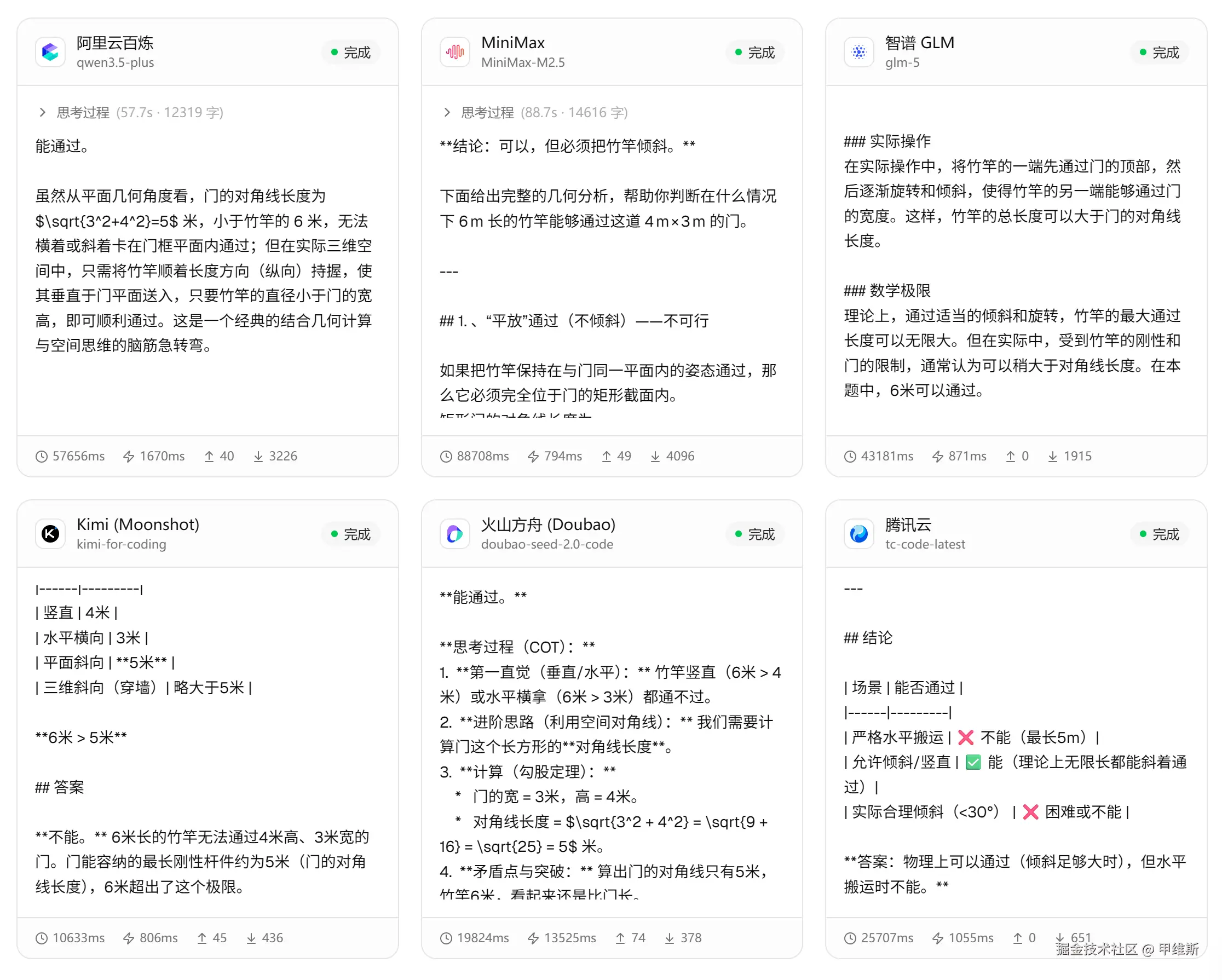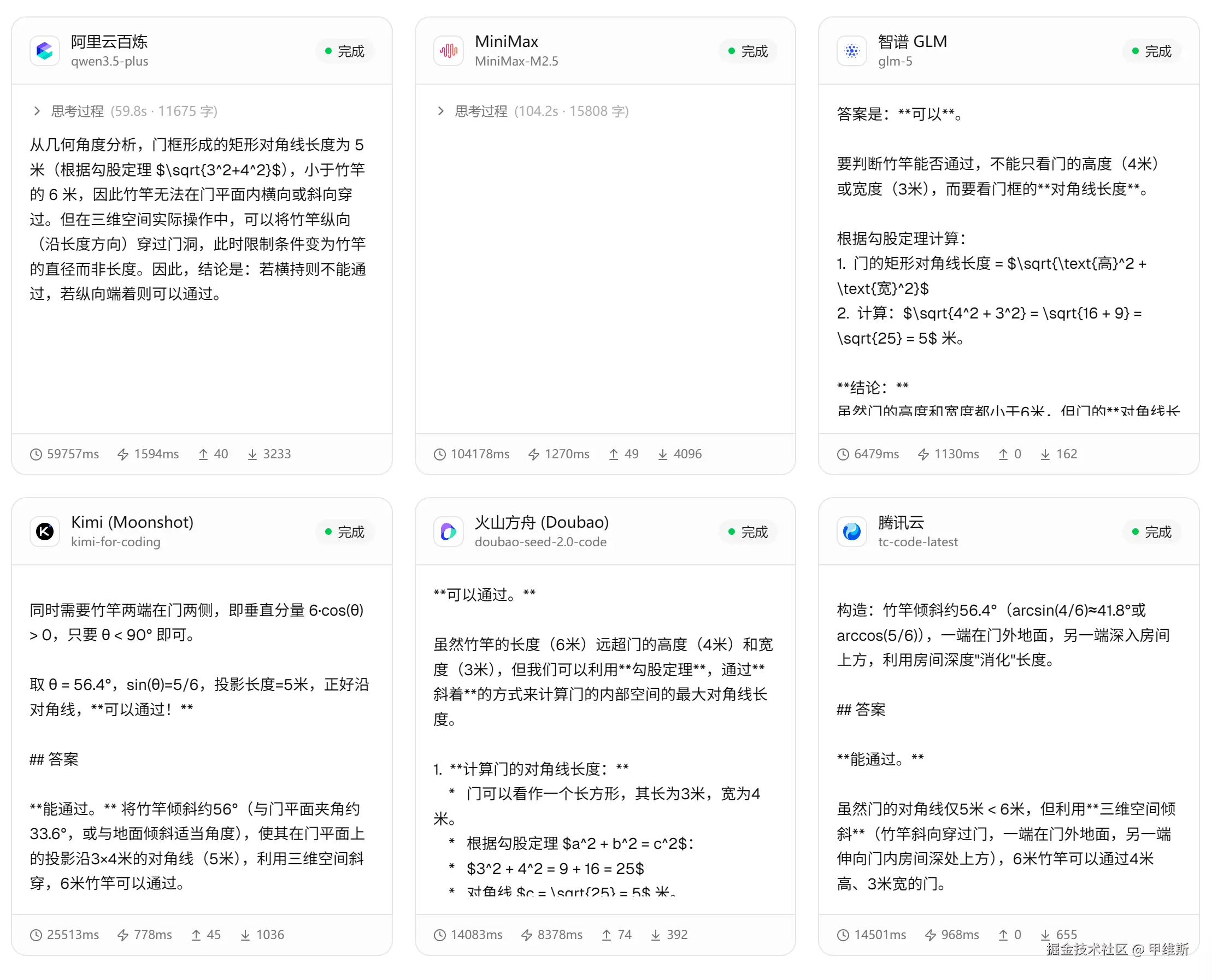 首先,我们可以看到MiniMax 和腾讯云交了白卷。就是思考卡住了,然后被截断了。