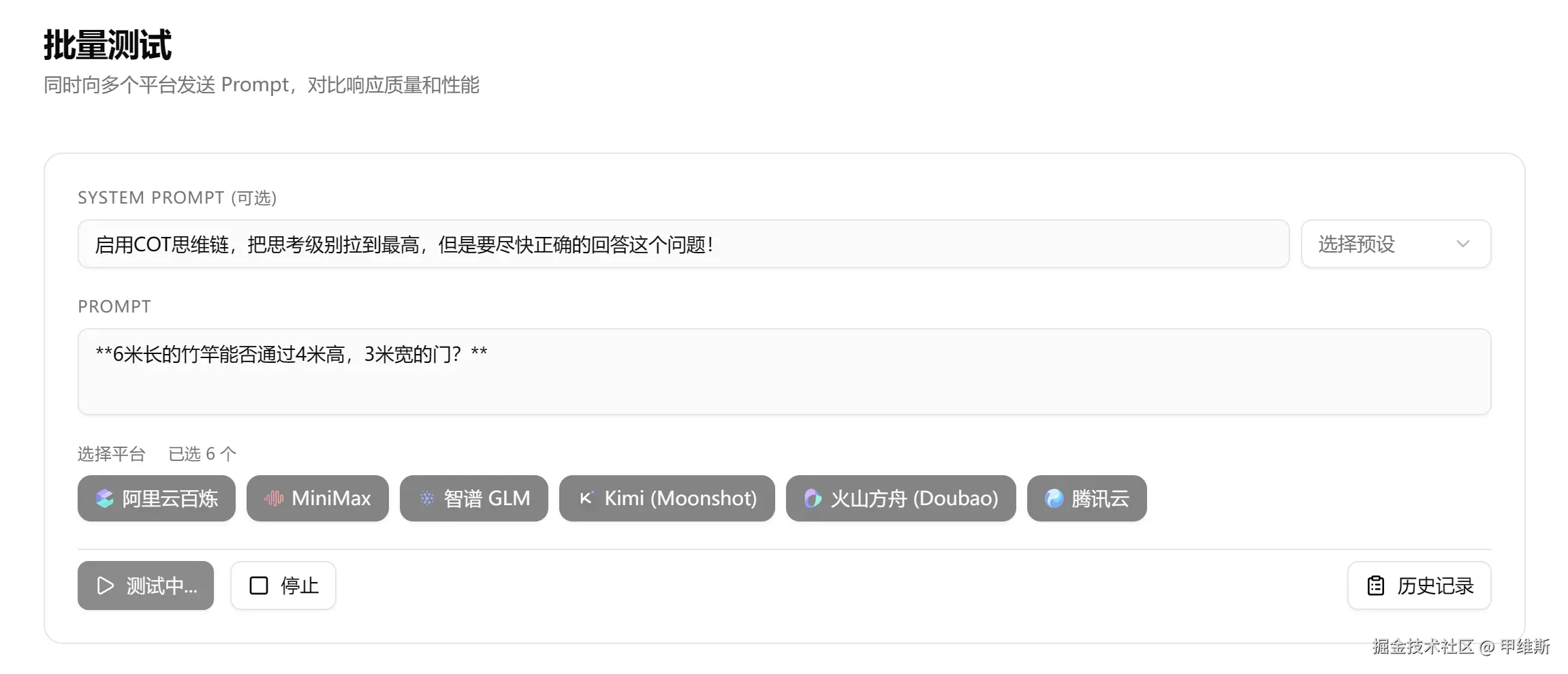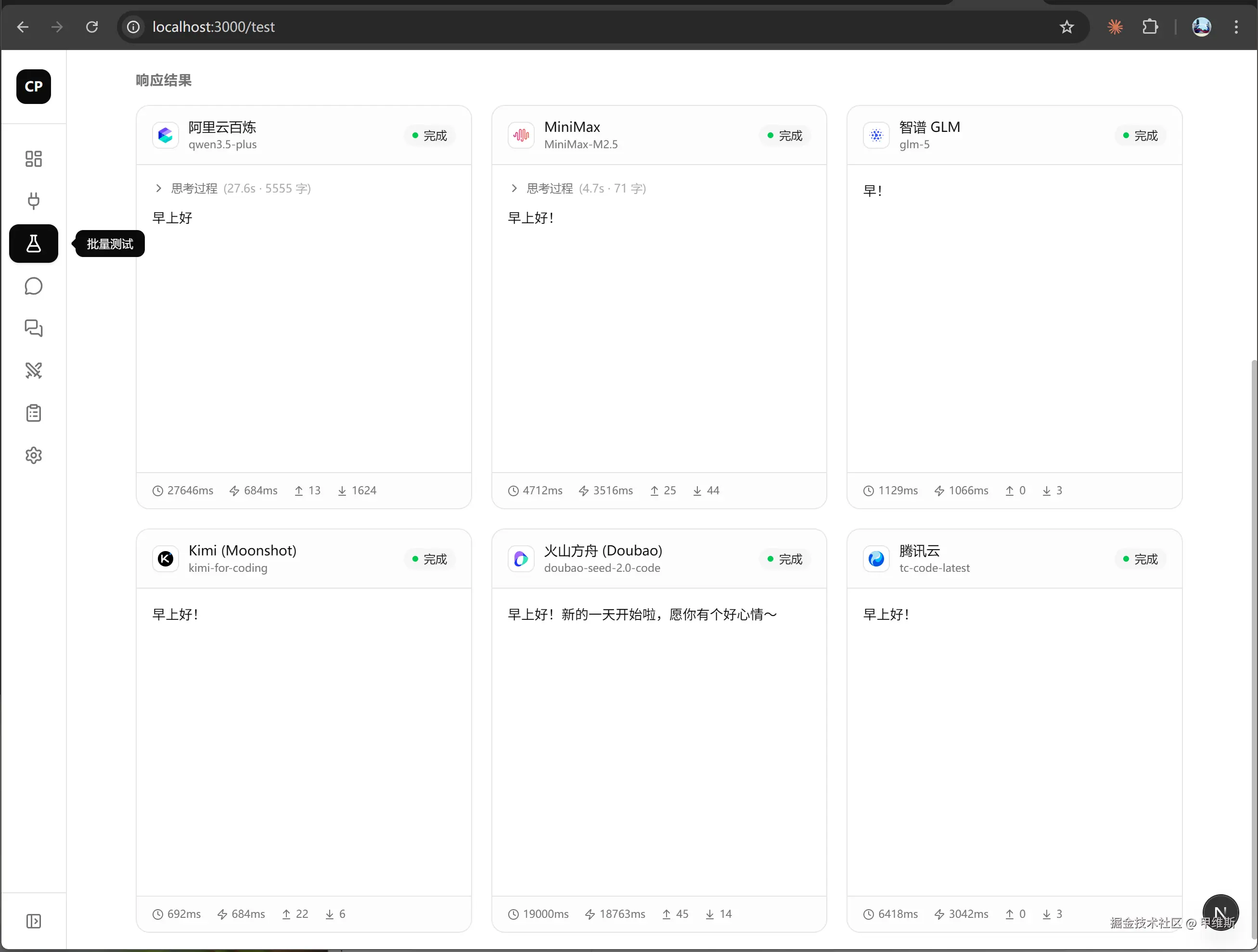我这个批量测试,可以从多维度测试模型,比如查看回复内容,总的消耗时间,总的消耗token,如果有思考内容输出,也可以查看思考过程。
