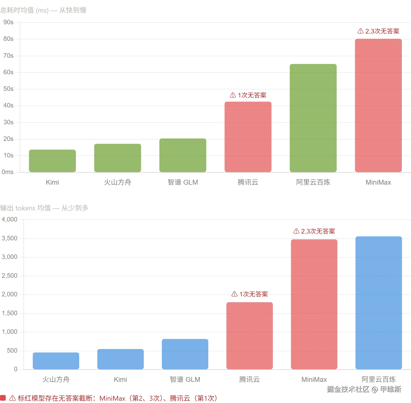 从图表中可以非常直观的看到,基于我的网络环境和测试问题来看,速度前三是:Kimi,智谱,MiniMax