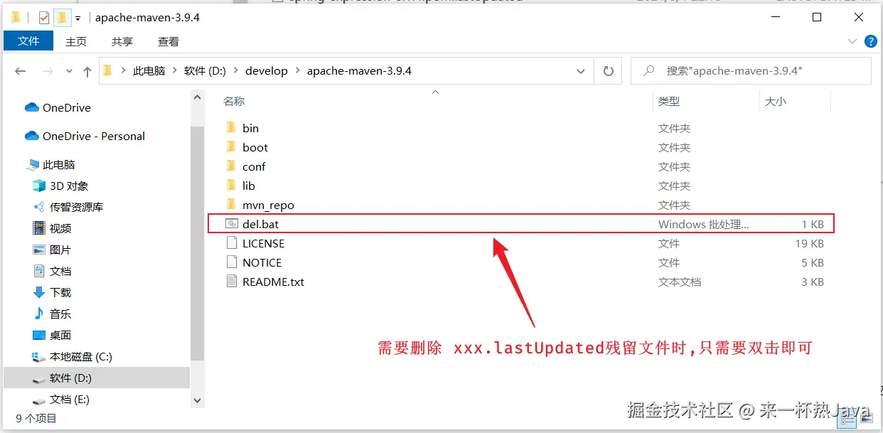 为了使大家能够方便的解决这个问题,大家可以将资料中提供的 del.bat 批处理脚本,拷贝到maven的安装目录下。 双击这个文件,就可以递归删除该目录下所有的 xxx.lastUpdated 文件。 放置目录如下所示:
