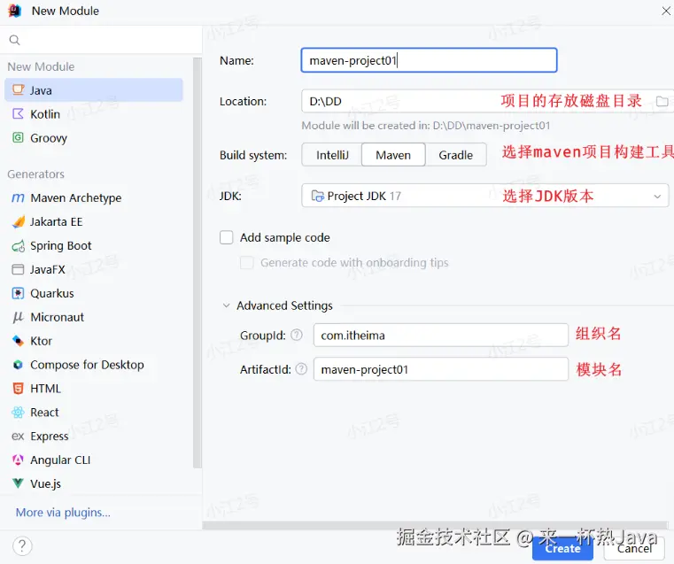 创建模块,选择Java语言,选择Maven。 填写模块的基本信息
