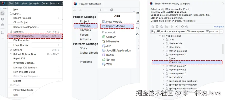 ● 方式一:File->Project Structure->Modules->Import Module->选择maven项目的pom.xml。