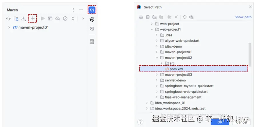 ● 方式二:Maven面板->+(Add Maven Projects)->选择maven项目的pom.xml。