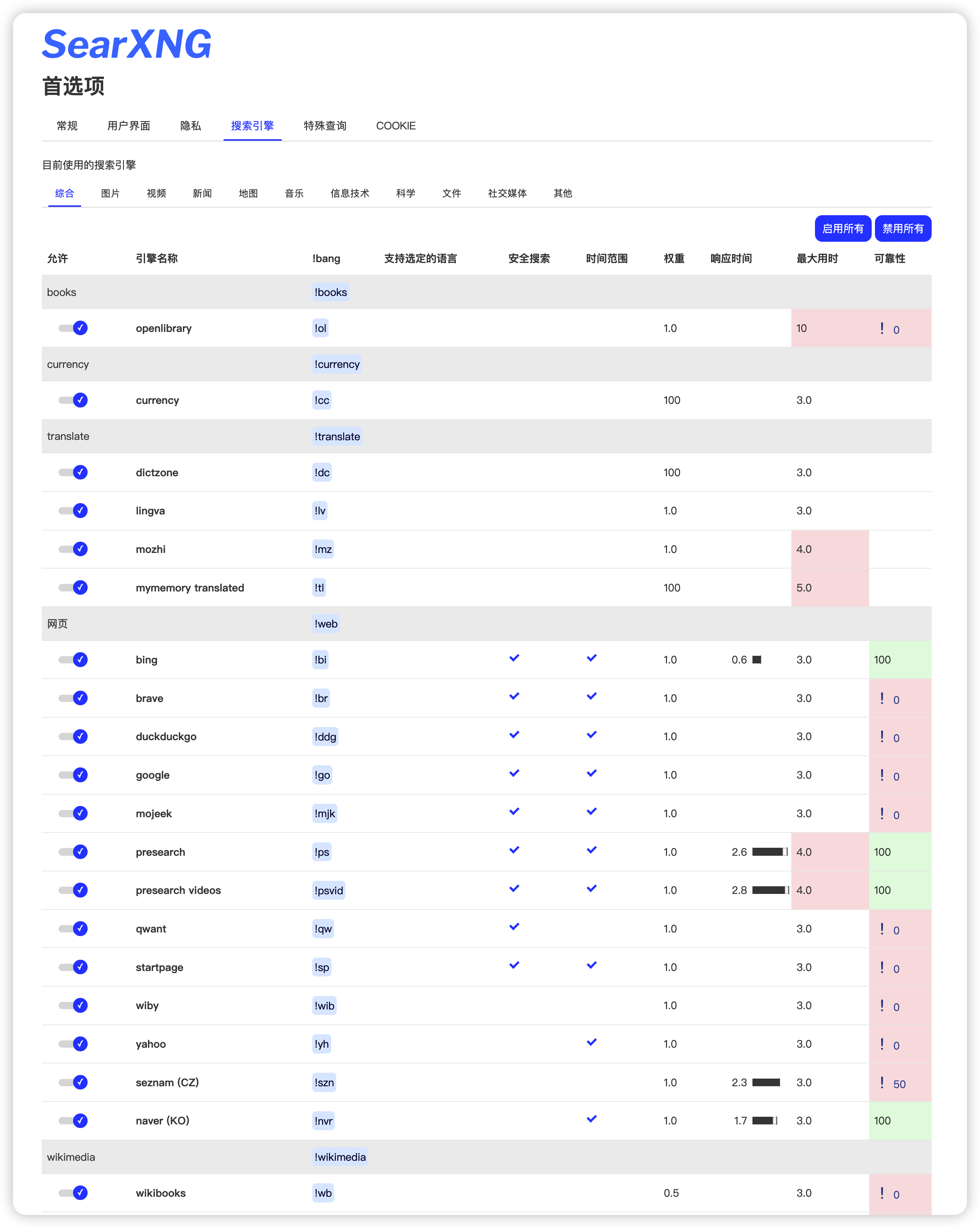 SearXNG 的搜索引擎可用性依赖网络环境,部分引擎无法使用那大概是网络不够科学。