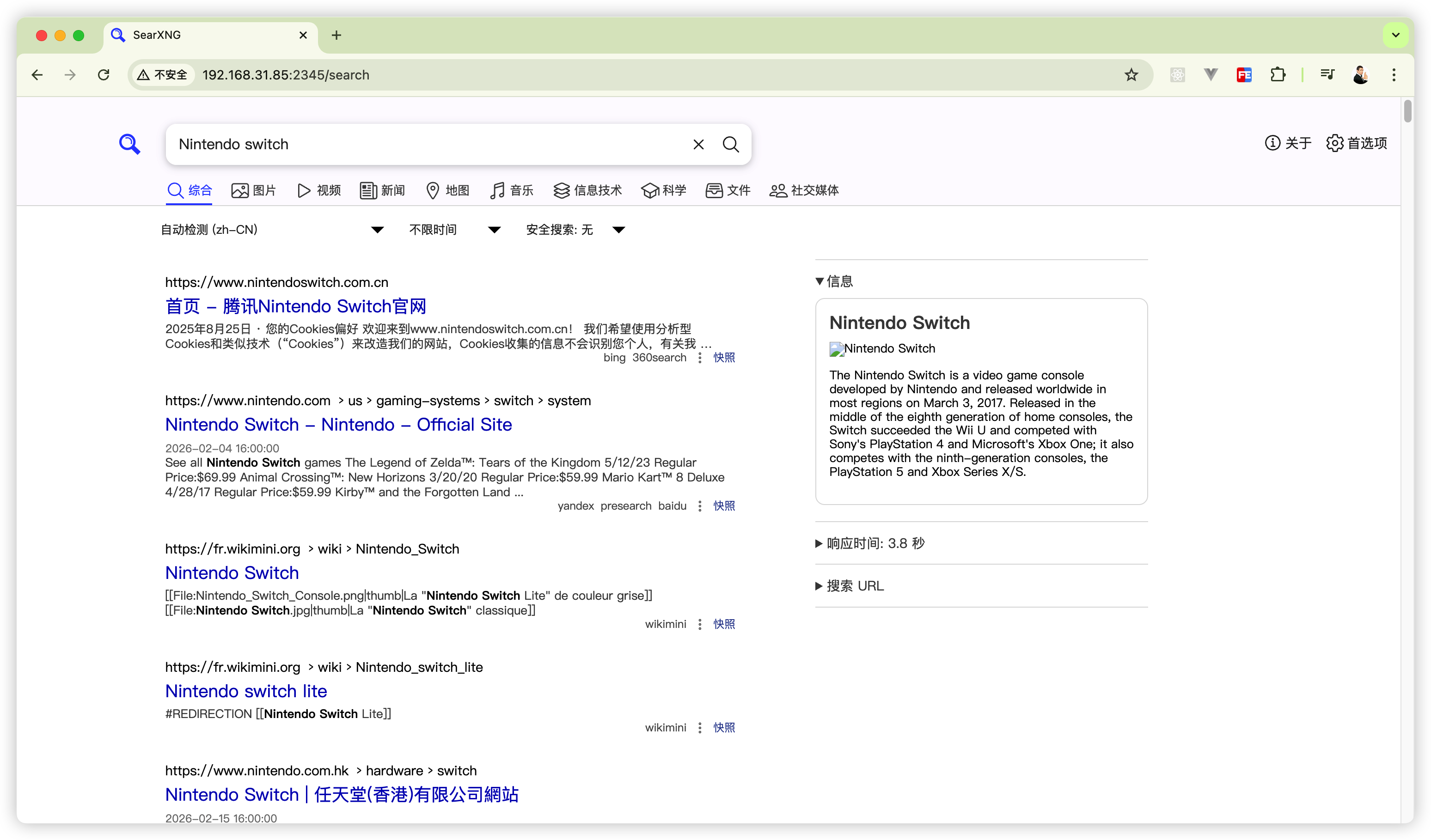 在 SearXNG 的搜索结果页面右侧有一个“响应时间”的列表,展开可以看到每个搜索引擎的耗时。由于网络原因,有很多是超时的,这也是为什么第一次搜索会那么久的原因。