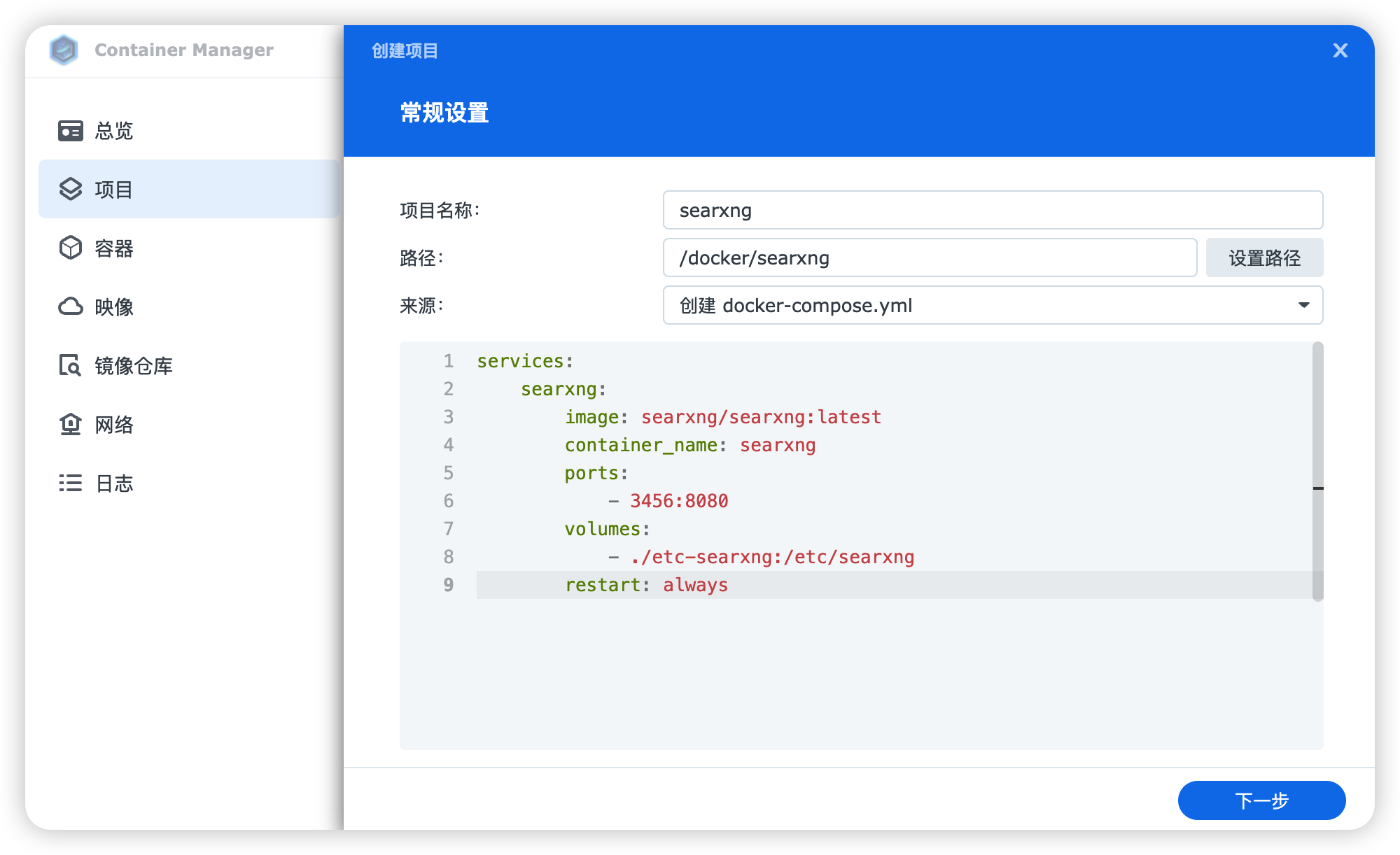 打开「Container Manager」应用,切换到 项目 面板点击新建,按以下信息配置: