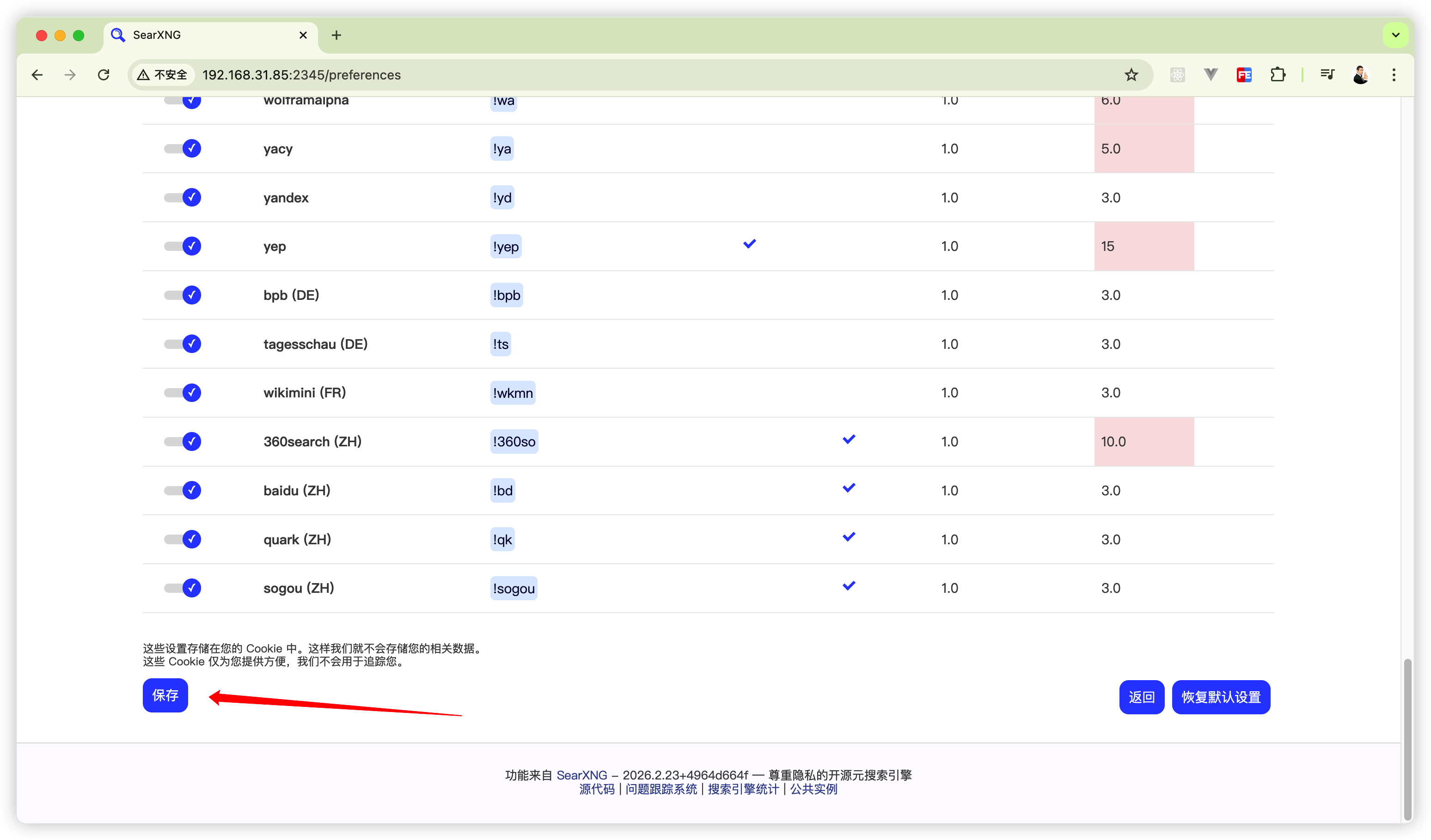 再次进入「首选项 - 搜索引擎」,禁用最右侧 “可信度” 为红色、值为! 0的搜索引擎,保存后搜索速度会大幅提升。