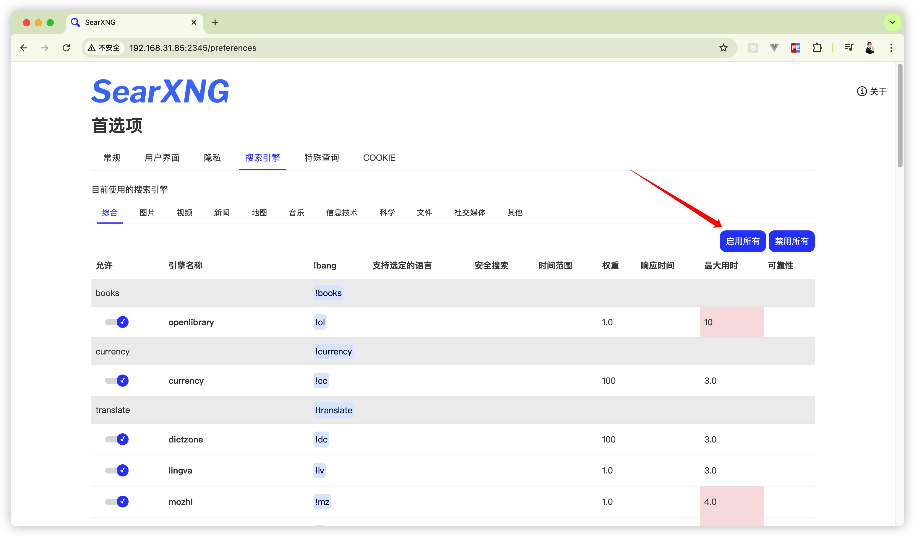 首次使用点击首页右上角「首选项」,进入 “搜索引擎” 页面点击「启用所有」。