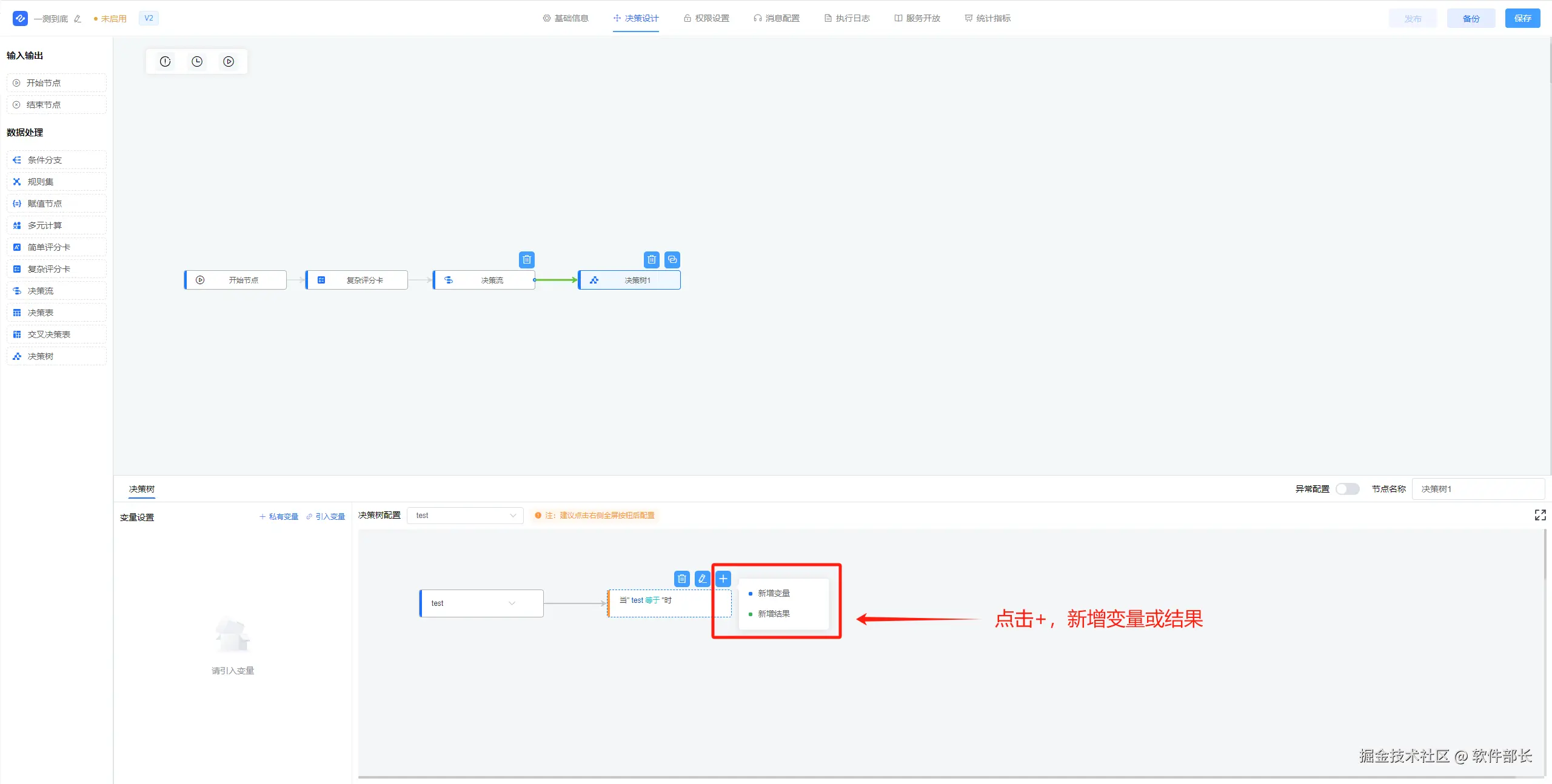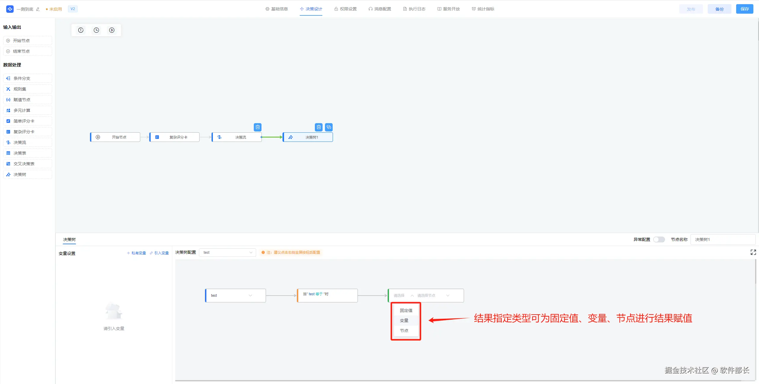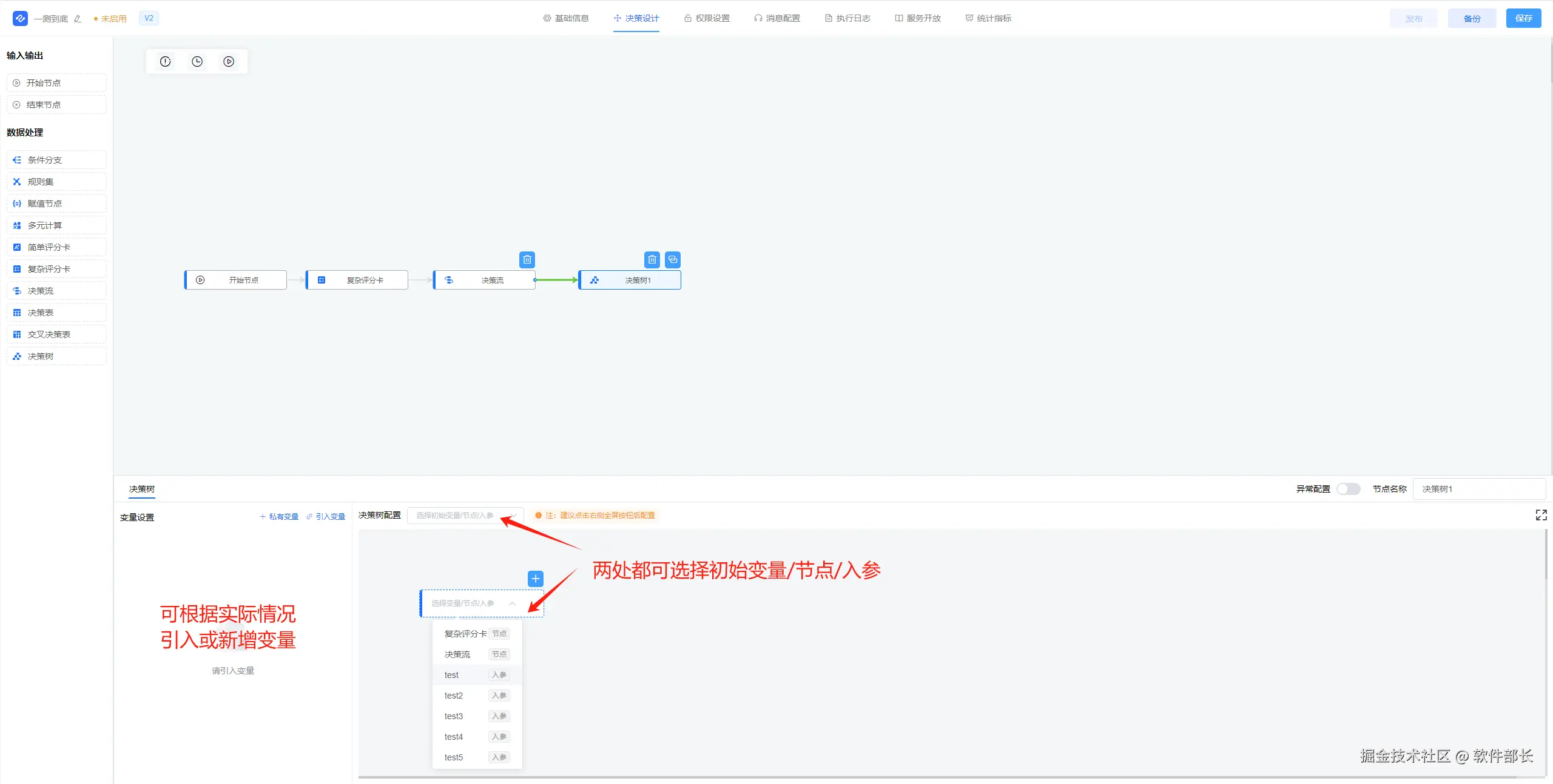 3、可根据实际情况新增或引入变量(需要用到变量进行赋值时),然后在决策树配置选择初始变量/节点/入参值。