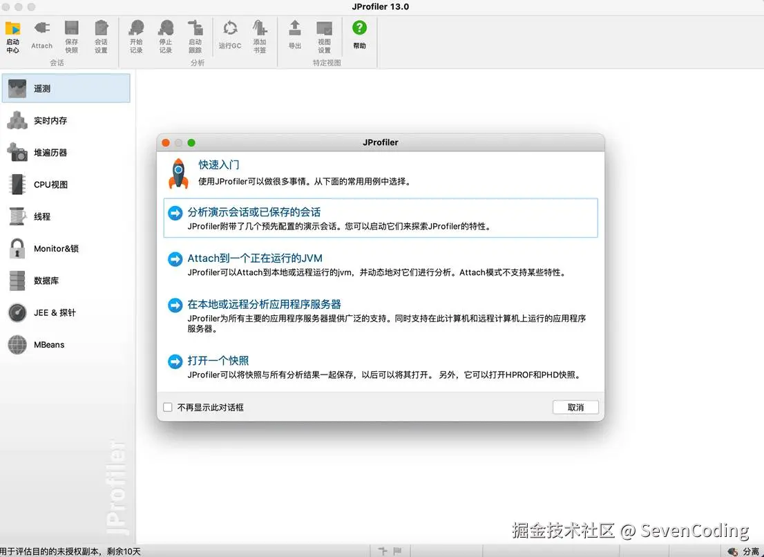 JProfiler UI 的主要功能是展示通过 agent 采集上来的分析数据,此外还可以通过它控制 agent 的采集行为,将快照保存至磁盘,展示保存的快照。