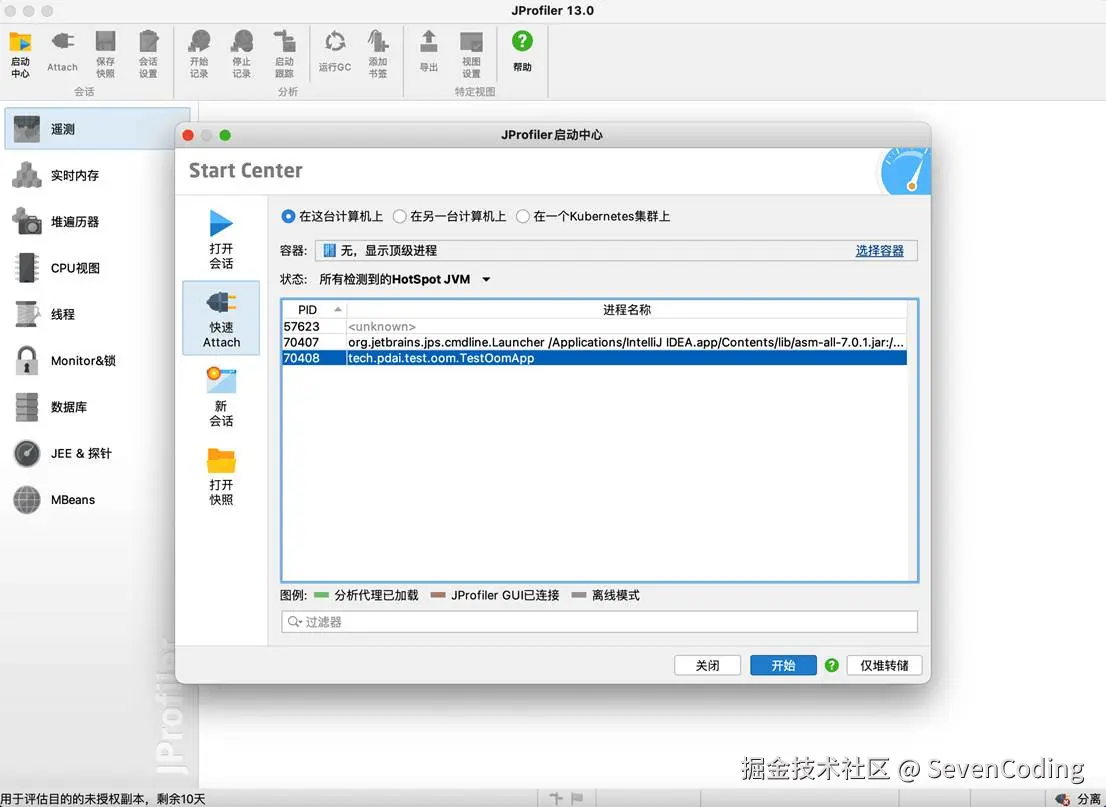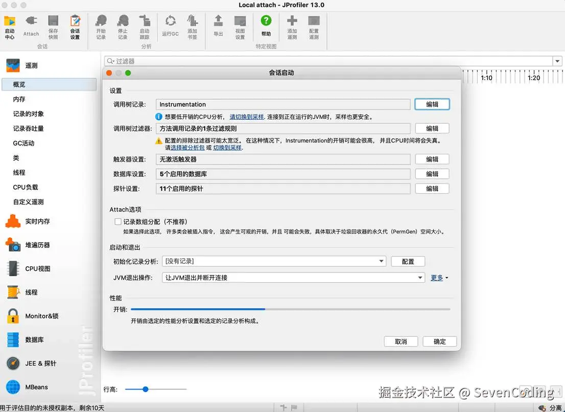 JProfiler agent 是一个本地库,它可以在 JVM 启动时通过参数-agentpath:<path to native library>进行加载或者在程序运行时通过JVM Attach 机制进行加载。Agent 被成功加载后,会设置 JVMTI 环境,监听虚拟机产生的事件,如类加载、线程创建等。例如,当它监听到类加载事件后,会给这些类注入用于执行度量操作的字节码。