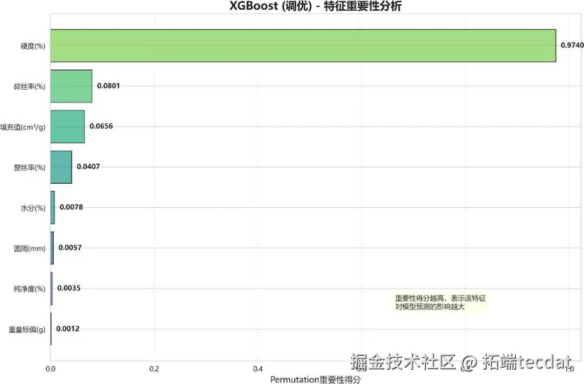 排列重要性分析再次确认了硬度(X6)的霸主地位,其重要性得分高达0.974,一骑绝尘。碎丝率(X2)和填充值(X3)则分列二、三位。
