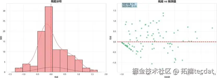残差(真实值与预测值的差)围绕0值上下随机分布,没有明显的“喇叭口”形状或其他模式。这说明我们的模型没有犯“系统性错误”,预测误差在不同预测区间内表现得比较稳定,模型是健康、可靠的。