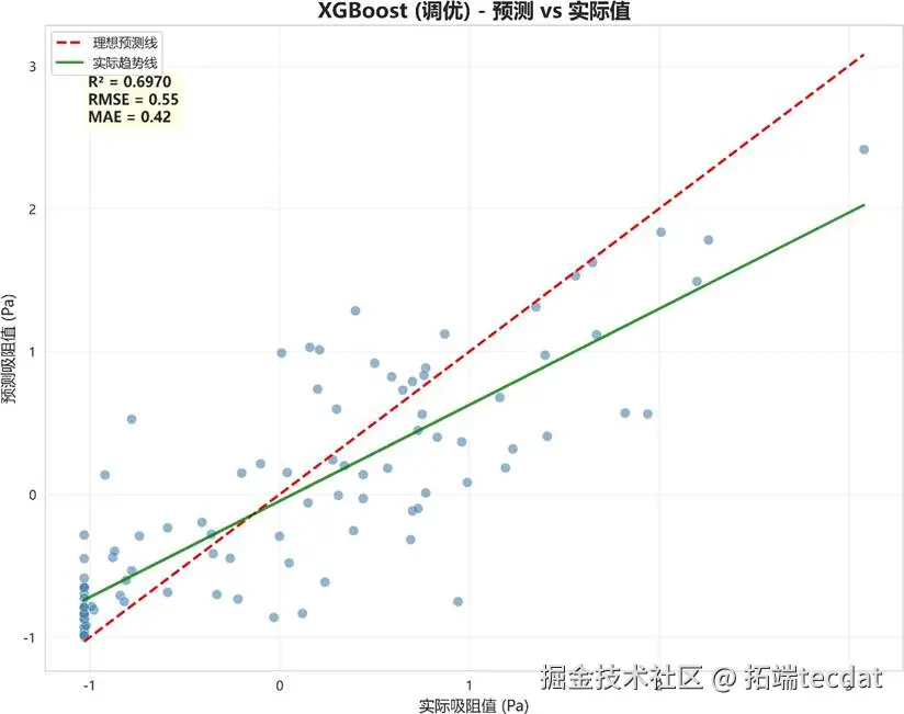 下图是优化后的XGBoost模型预测值与实际值的对比散点图。点越靠近45度对角线,表示预测越准。