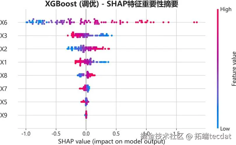 仔细观察硬度(X6)这一行,你会发现一个清晰的“左蓝右红”的分布。这意味着:硬度值越低(蓝色点),其SHAP值为负,指向更小的吸阻;硬度值越高(红色点),SHAP值为正,指向更大的吸阻。这个发现将之前的负相关关系,从“是什么”推进到了“如何影响”的层面,为工艺调参提供了精准导航。