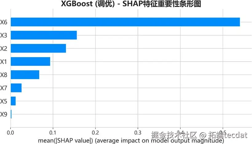 SHAP提供的条形图则给出了另一种量纲下的重要性排序,但结论是一致的。