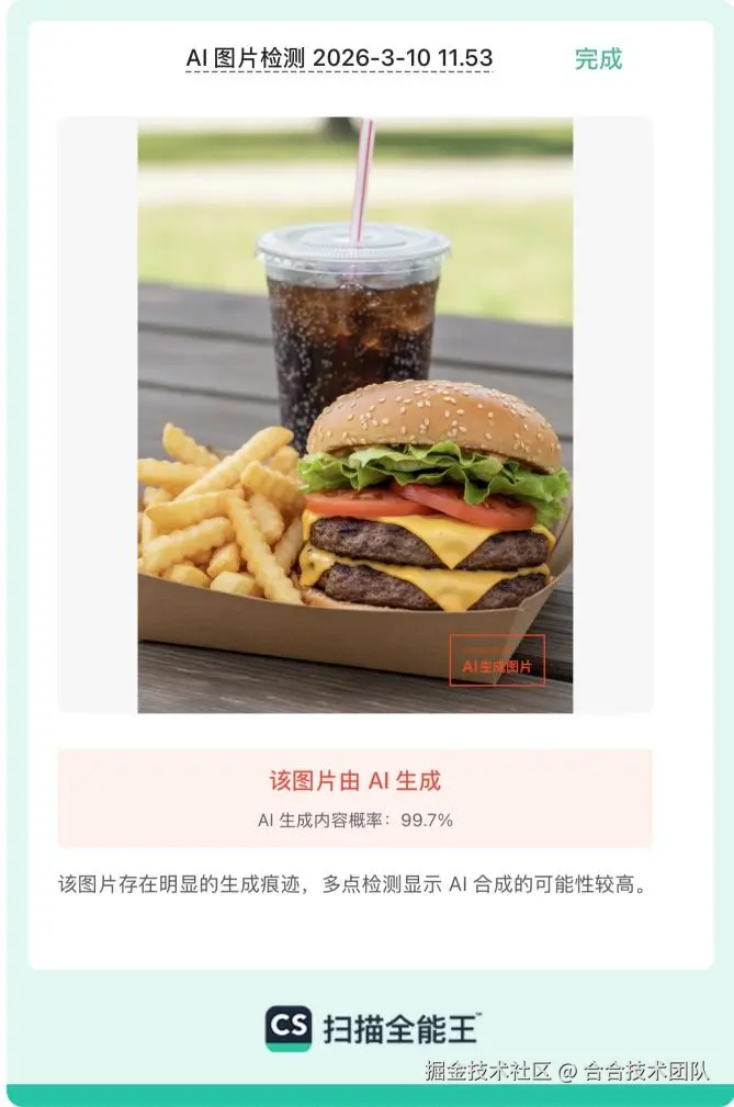 图说:扫描全能王“AI图片检测”功能精准识别AI生成的食物类图像