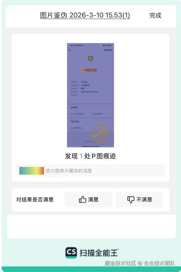 在AI造假泛滥的同时,部分不法分子还会使用PS等传统修图工具对真实图片进行篡改。扫描全能王已上线“图片鉴伪”功能,可精准检测支付截图、合同扫描件、银行流水单等文档图像的PS篡改痕迹。基于自研多模态篡改检测大模型,扫描全能王能够在检测到异常时输出可定位的篡改区域与证据提示。目前,该技术能力已通过中国信通院“文档图像篡改检测平台能力完备性”认证,为资料核验、票据报销、合规审查等场景提供安全保障。