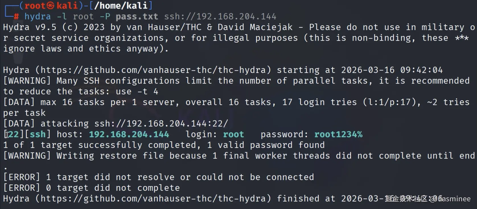 - 攻击机获取 root 权限(用于执行 Hydra 破解命令)
