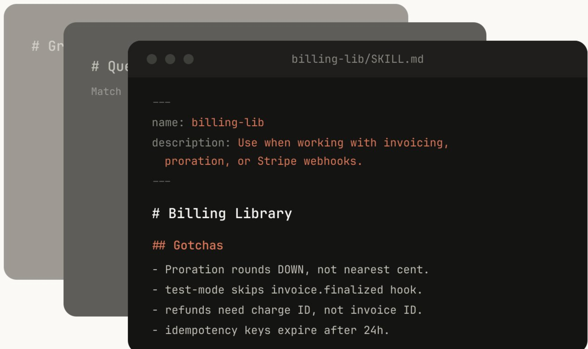 billing-lib— 您的内部计费库:边缘情况、潜在陷阱等。internal-platform-cli— 您的内部 CLI 包装器的每个子命令,并附带何时使用它们的示例。frontend-design— 让 Claude 更擅长您的设计系统。