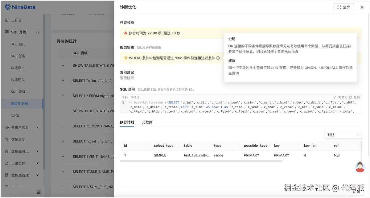 - NineData 社区版在本文讨论的范围里,解决的是慢 SQL 治理层问题。
