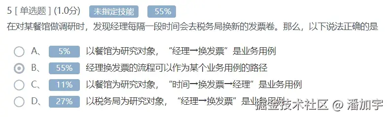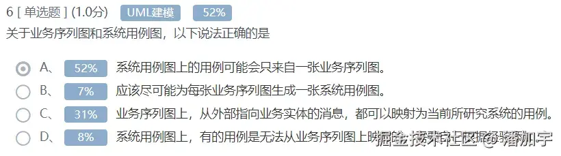 67%的人选了A,A是错的。《软件方法》第8章:涉众常使用的词汇不一定是合格的领域术语。涉众经常使用一些不严谨的称呼,例如用颜色来表征:绿本(小产权证)、绿卡(永久居民卡)、绿单(预约单)。