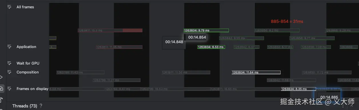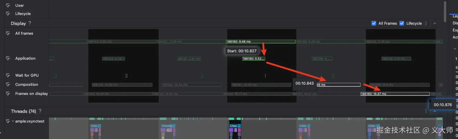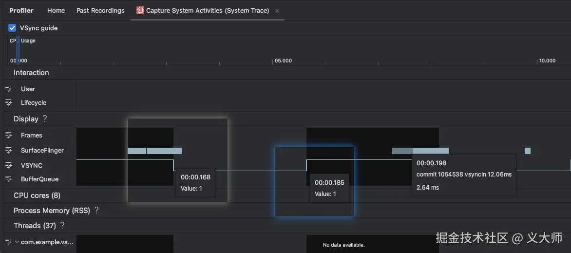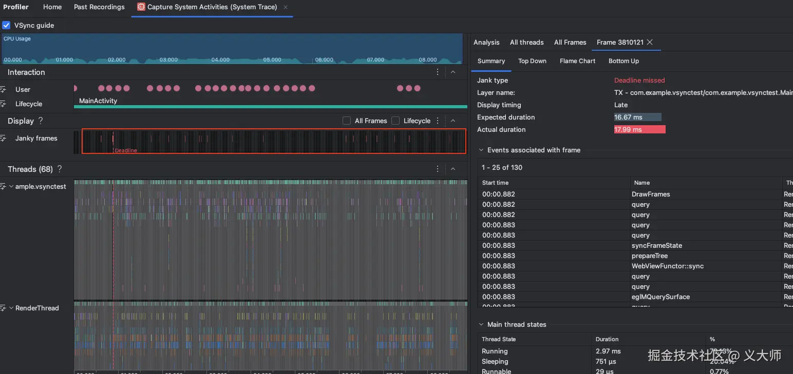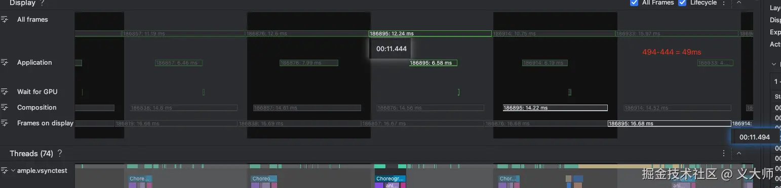 Android Studio也有性能面板工具供我们查看Vsync的间隔