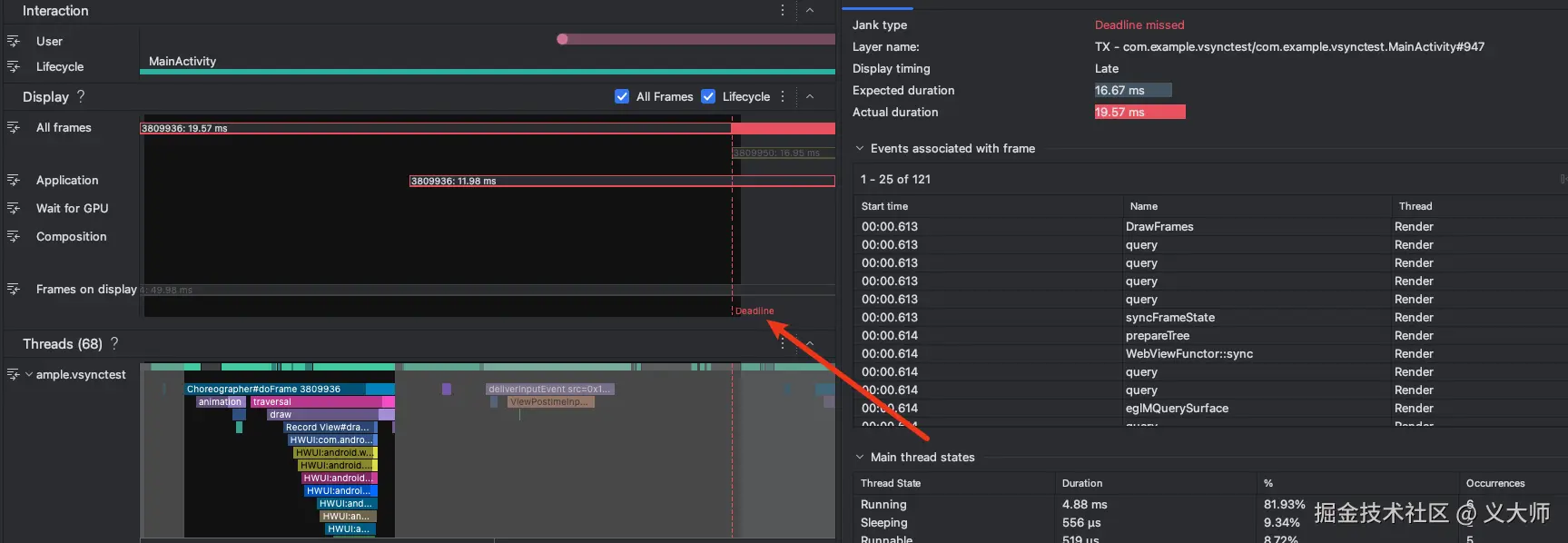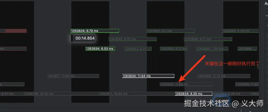 可以看到确实存在了不少的jank frame,我们取一帧来看一下详情