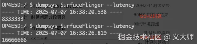 屏幕保持的时延普遍是16ms,部分是8.33ms,这个猜测是因为下一个帧还没通过SF合成,画面只能继续重画上一帧