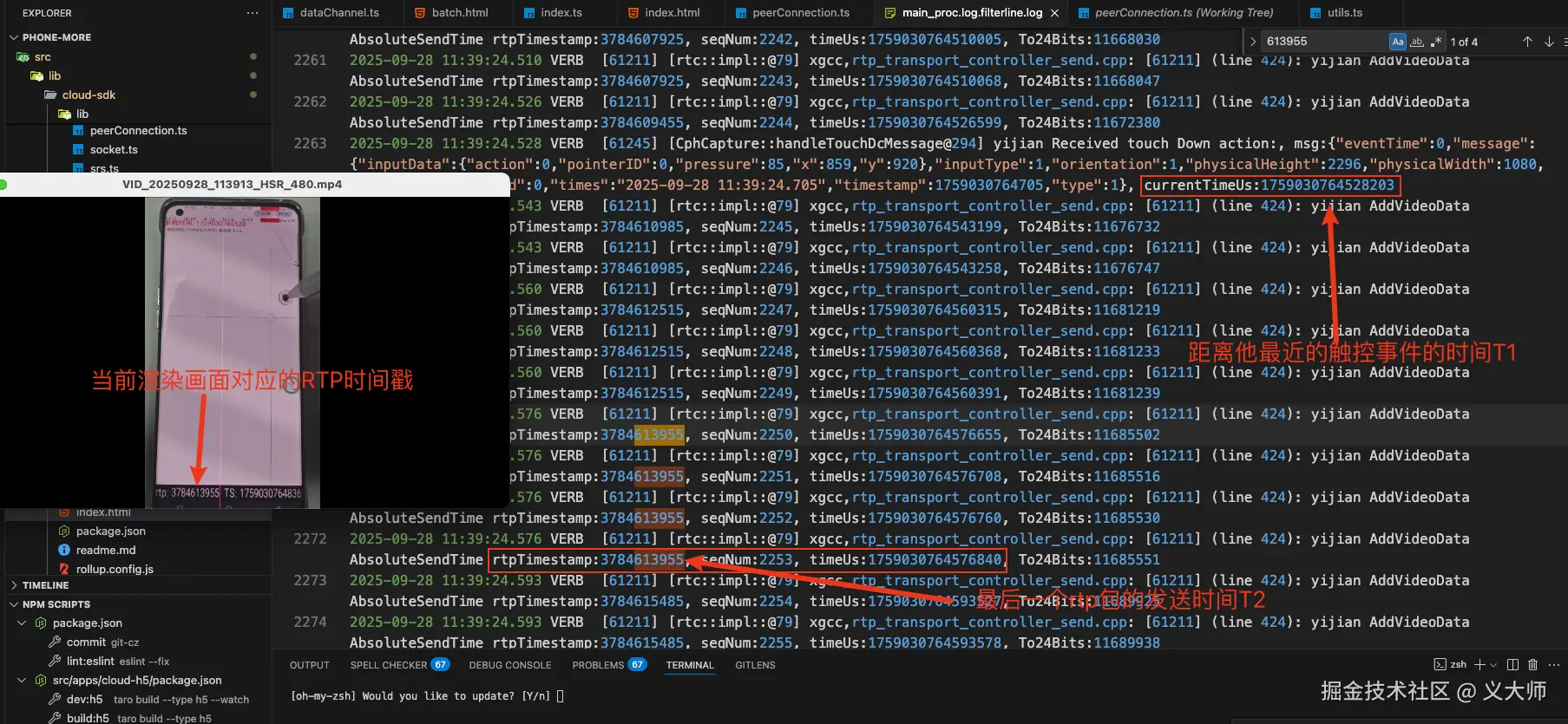 怎么得到这个时延?这个时延在理论上应该是云测的云机接收到第一个触控事件的时间到云侧的发生变化画面被编码之后,得到发送的最后一个帧的RTP包的发送时间之差。那我们就可以先在云测打印所有的触控事件的时间,和所有RTP包的发送时间,这样他的日志文件我们就可以作为一个参考值,端侧在渲染画面的时候,每一帧的画面组成的所有的RTP包的时间戳是一样的,这样,我们就可以在渲染这个画面的时候打印他的RTP的时间戳,然后对应起来