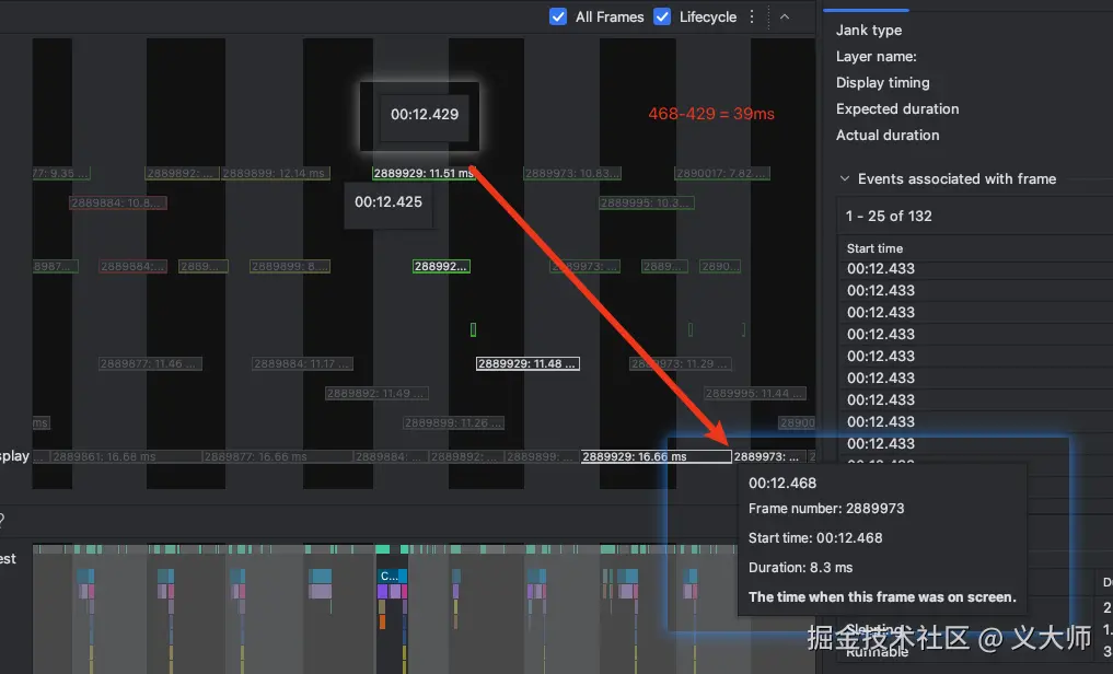 并且安卓的控制面板也看到相应的Vsync在时间上面产生的间隔,证明我们的刷新理论没有问题,并且如果发生jank的情况我们取一个样本来看,是经过39ms