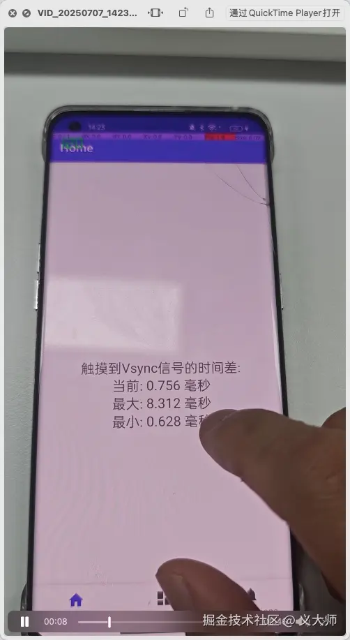 这里和我们上面推断一样,触控事件的到最近的一个Vsync信号的时延是取决于屏幕的刷新间隔,这里按照上面的测试值我们可以取【0.5ms~屏幕刷新间隔】。这部分验证通过,不过这个方案只有APP可以采用,H5没有相关接口可以获取这个值。
