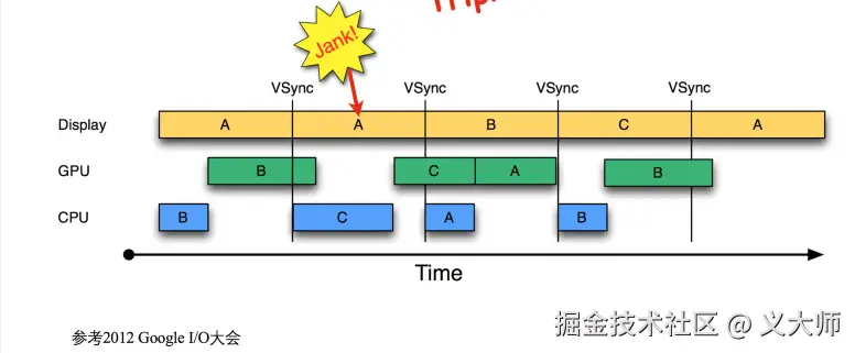 这里代表的是流程是Vsync信号之后,APP主线程开始计算并绘制 -> 渲染线程接受绘制数据,使用OpenGL之类的工具 库执行渲染,并将渲染之后的数据提交给BufferQueue供SF进行合成-> SF合成 -> SF合成之后-> 提交显示器进行显示。