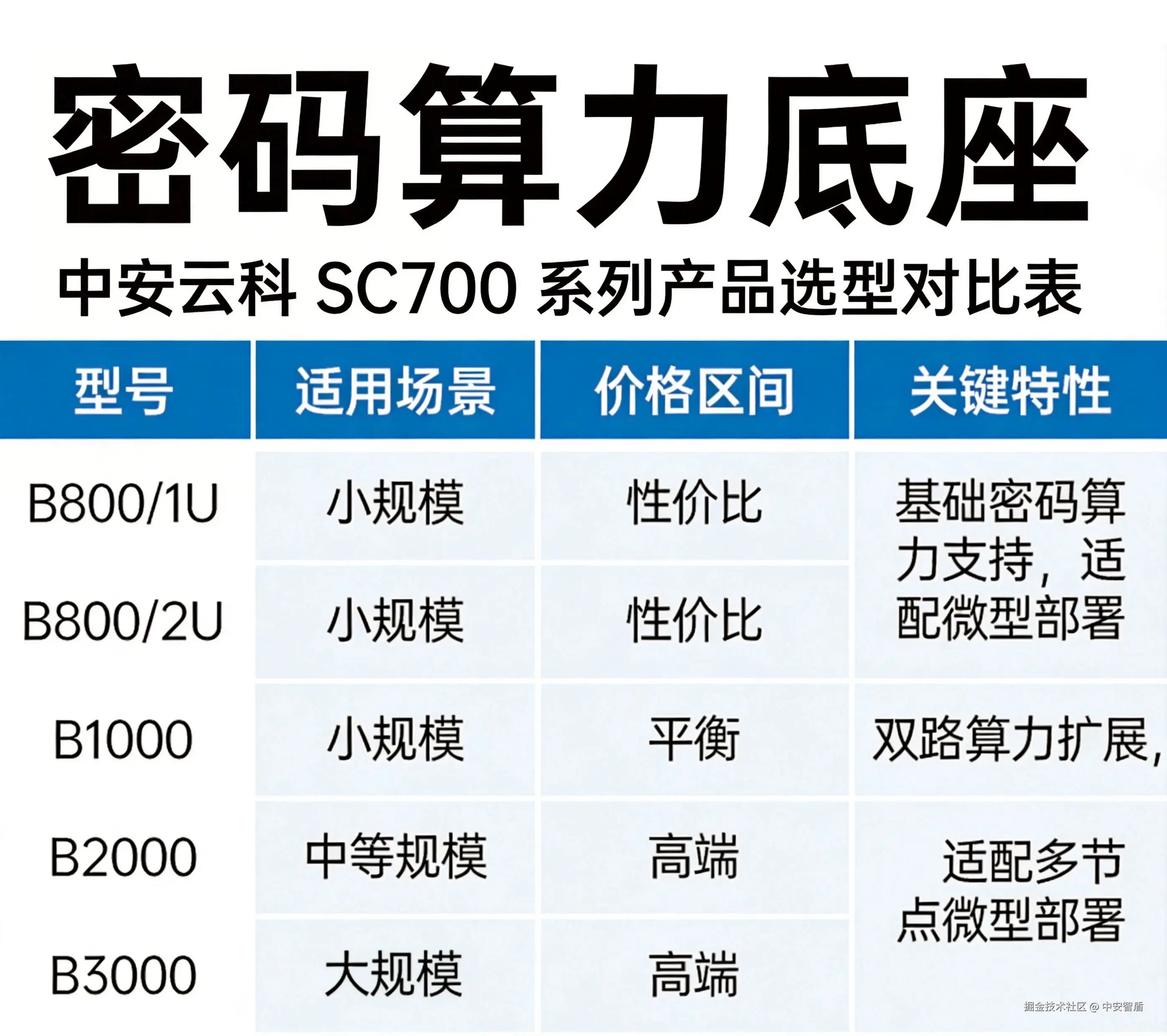 中安云科 SC700 系列包括 B800/1U、B800/2U、B1000、B2000、B3000 五种规格,从入门到高端,覆盖不同规模的密码算力需求。