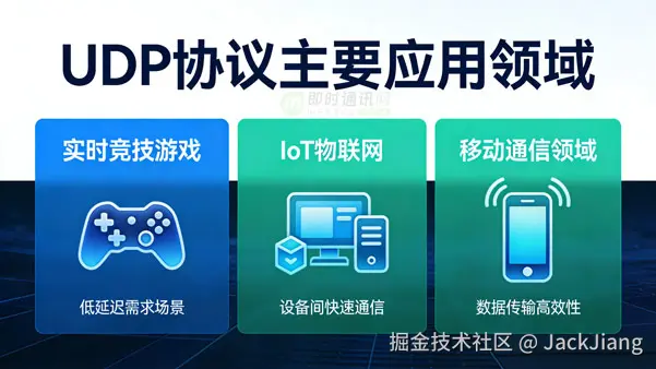 针对上面的三大场景,UDP 常用在实时竞技游戏,IoT 物联网,移动通信领域。